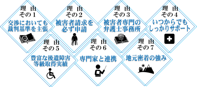 交通事故被害者の方に寄り添い、事故直後から解決まで親身に寄り添って弁護しており、下記の理由により、頼れる交通事故相談の弁護士事務所としてお選びいただいております。
