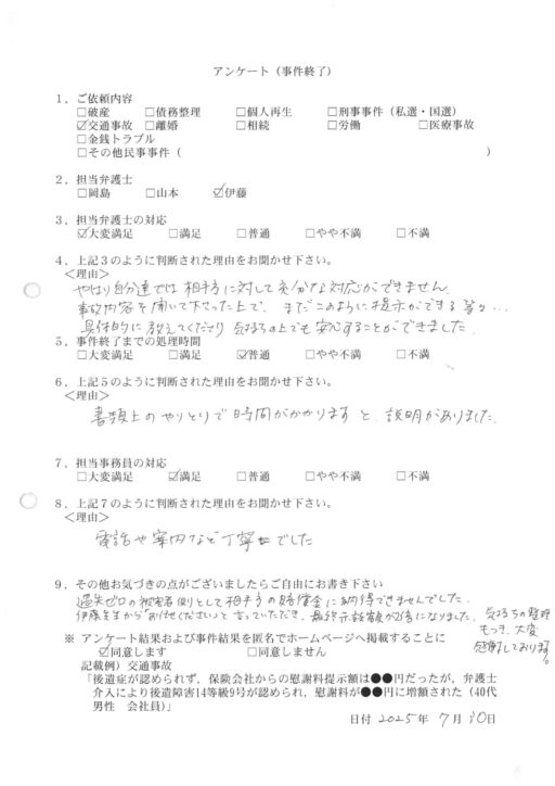 やはり自分達では相手方に対して充分な対応ができません。事故内容を聞いて下さった上で、まだこのように提示ができる等々…具体的に教えてくださり気持ちの上でも安心することができました。書類上のやりとりで時間がかかりますと説明がありました。過失ゼロの被害者側として相手方の賠償金に納得できませんでした。伊藤先生から「お任せください」と言っていただき、最終示談額が2倍になりました。気持ちの整理もつき、大変感謝しております。