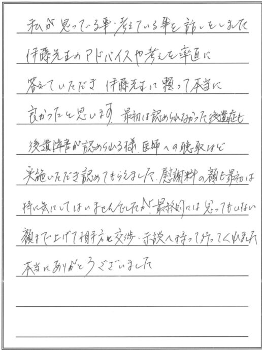 私が思っている事・考えている事を話をしました。伊藤先生のアドバイスや考えを率直に応えていただき、伊藤先生に頼って本当に良かったと思います。最初は認められなかった後遺症も後遺障害が認められる様、医師への聴取など実施いただき認めてもらえました。慰謝料の額も最初は特に気にしてはいませんでしたが、最終的には思ってもいない額まで上げて相手方と交渉・示談へ持って行ってくれました。本当にありがとうございました。
